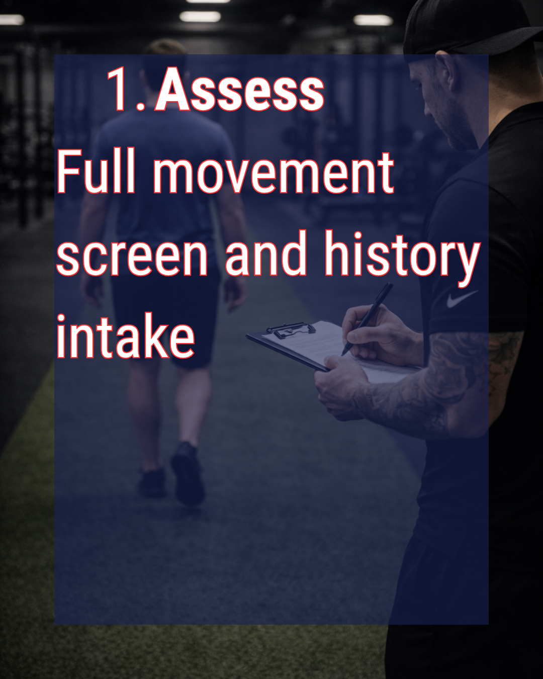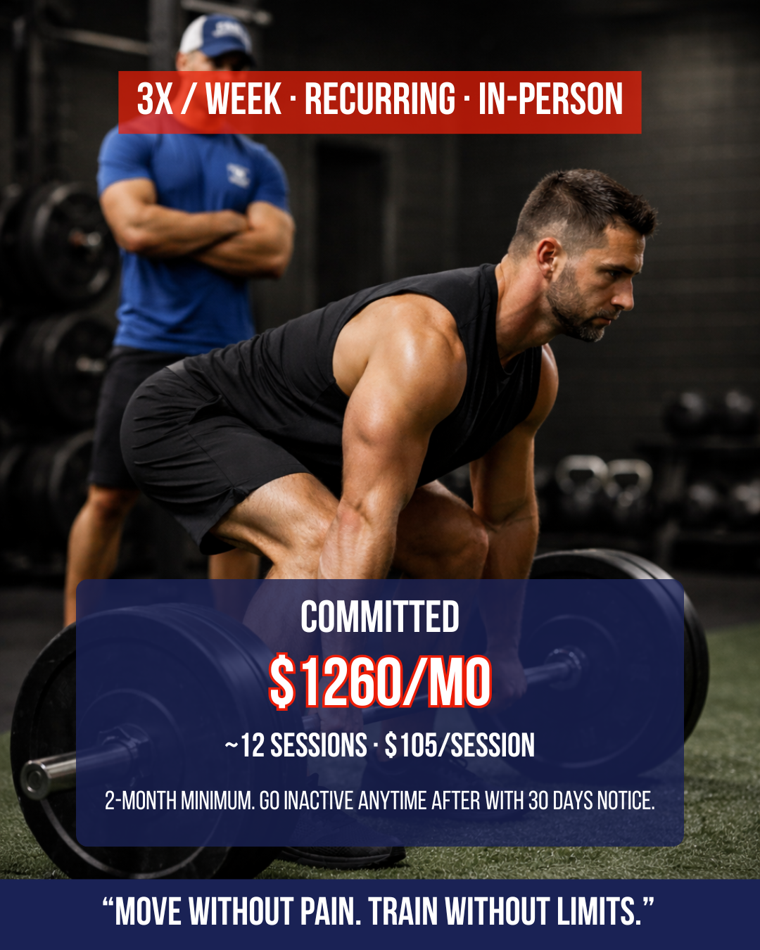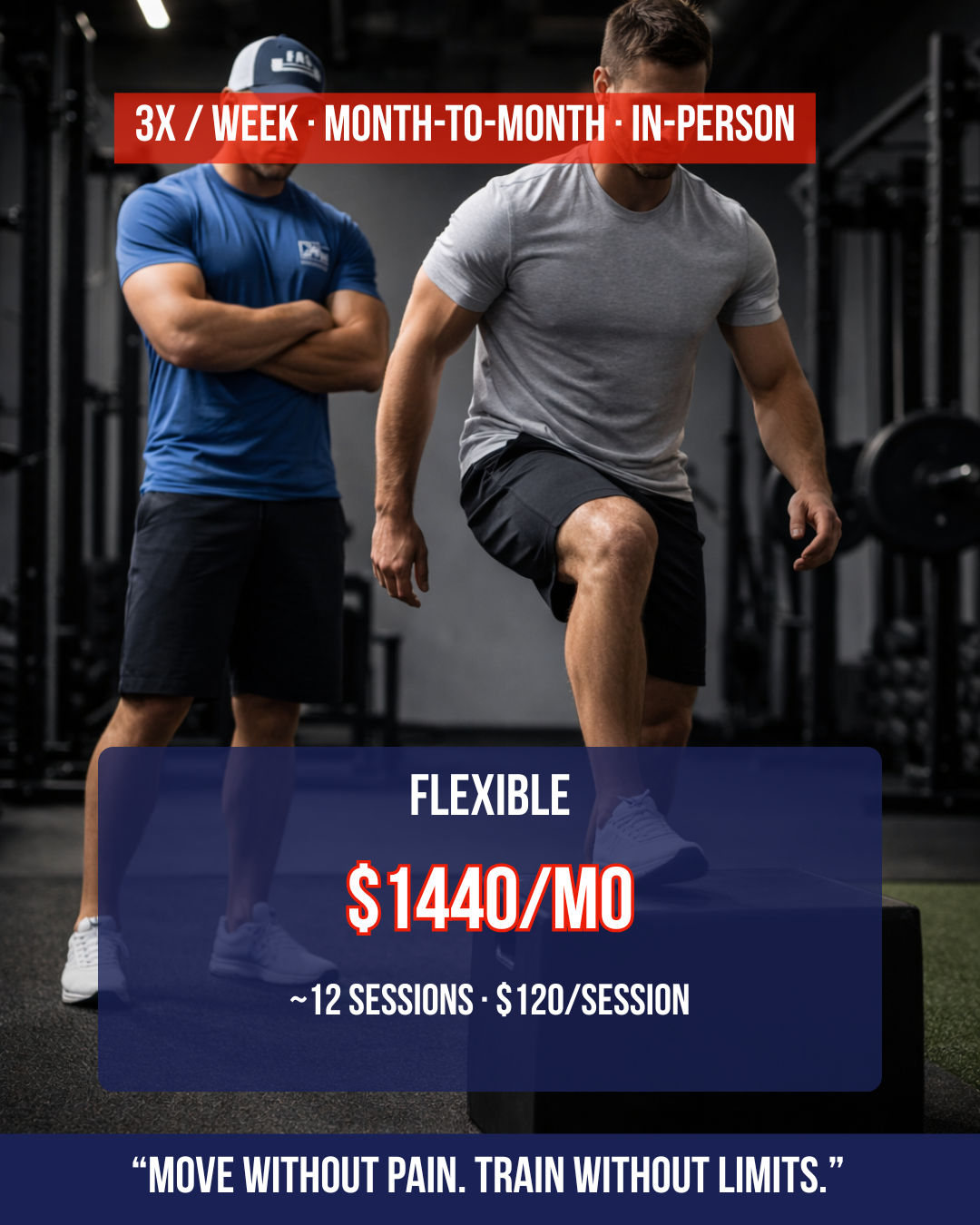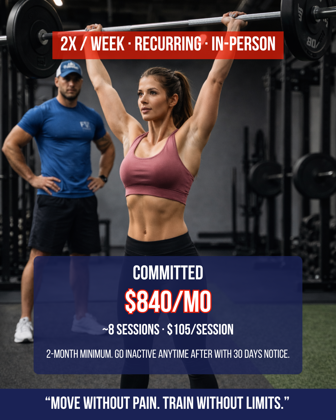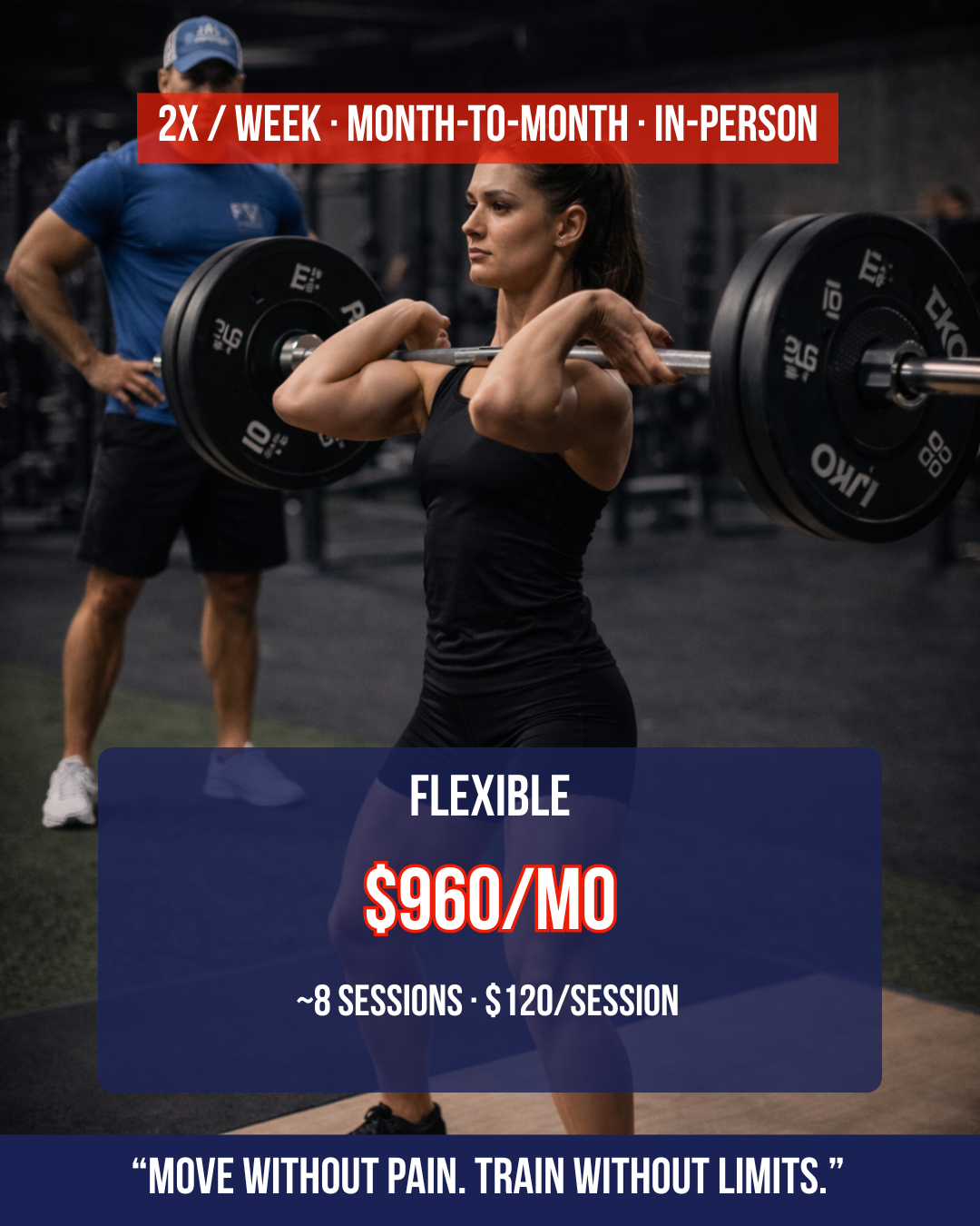Every program begins with a movement assessment and is built around your specific history, goals, and limitations — whether we work together in person or online.